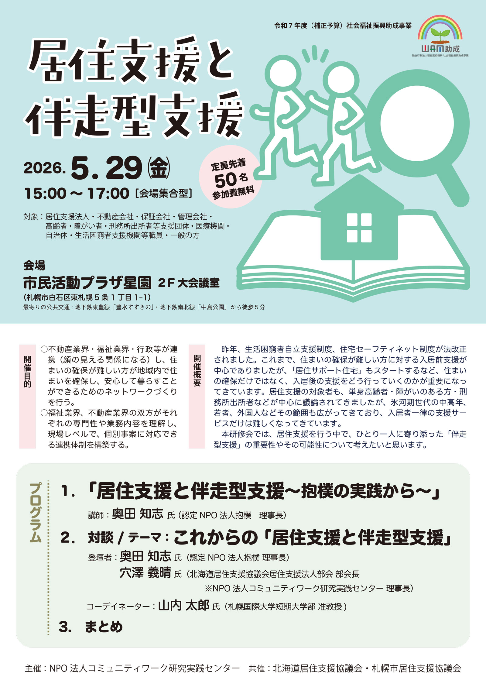 開催目的: ○不動産業界・福祉業界・行政等が連携(顔の見える関係になる)し、住まいの確保が難しい方が地域内で住まいを確保し、安心して暮らすこ…