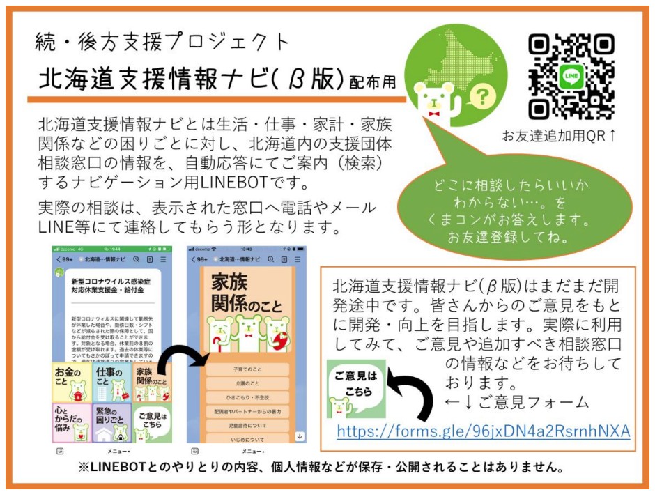 そこで、2021 年度は「続・後方支援プロジェクト」として、これまで培ってきた道央圏を中心としたネットワークを北海道内全域に展開し、【Ⅰ】生活困窮者支援者の孤立を防ぐため生活困窮者支援機関の情報交換の場を作ること、【Ⅱ】孤立する生活困窮者が支援情報に用意にアクセスできる仕組みを構築すること、【Ⅲ】支援に使える支援メニュー(後方支援メニュー)を試験的に実施し、支援実績のある自治体から支援実績のない自治体へのノウハウ提供、各自治体の社会資源の不足を補う中間支援事業を行うことを目的として事業を進めました。また「北海道生活困窮者支援ネットワーク」のあり方に関する検討委員会を開催し、北海道の生活困窮者支援のためのネットワークおよび中間支援組織の構築について検討を行いました。